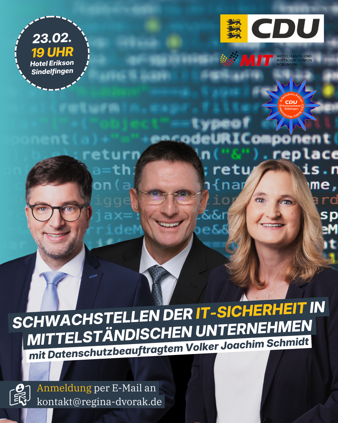 Datum des Artikels 13.02.2026 mit dem Datenschutzexperten Volker Joachim Schmidt am Montag, 23. Februar 2026 um 19 Uhr im Hotel Erikson in Sindelfingen. Tags Termin Empfehlen Sie uns!Bei Facebook teilen Bei Twitter (X) teilen Bei Whatsapp teilen Diese Seite drucken Diese Seite einem Freund schicken